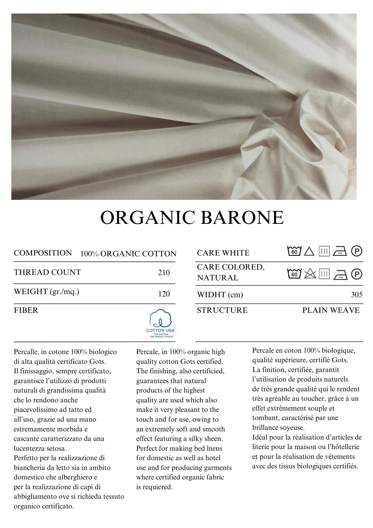 Le tissu Organic Barone en 100% coton biologique est idéal pour la confection de linge de lit haut de gamme et d’articles textiles respectueux de l’environnement. Effectivement, son tissage serré assure une texture lisse et résistante en offrant un toucher doux et frais. Il est apprécié aussi bien par les particuliers que par les professionnels du textile et de l’hôtellerie.